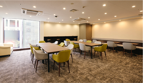 レッスンの前後にくつろぐことができる開放感のあるロビーラウンジ。講師と受講生の皆様が気軽に会話を楽しめる空間です。